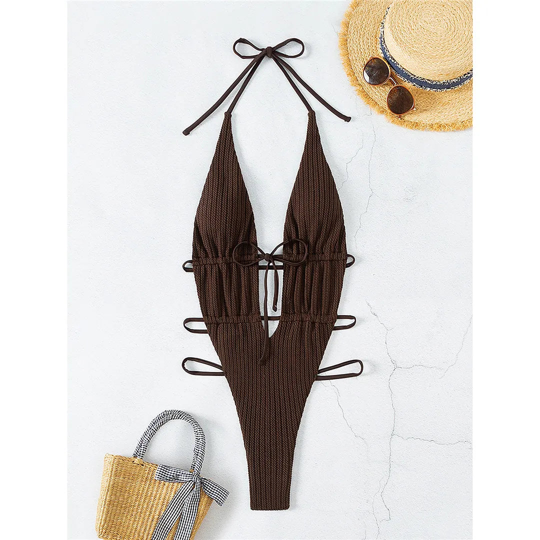 Featuring a deep V neckline, delicate front tie, and side cutouts that flatter the waistline, this one-piece is made for sun-soaked escapes, golden hours, and sophisticated beachside lounging.