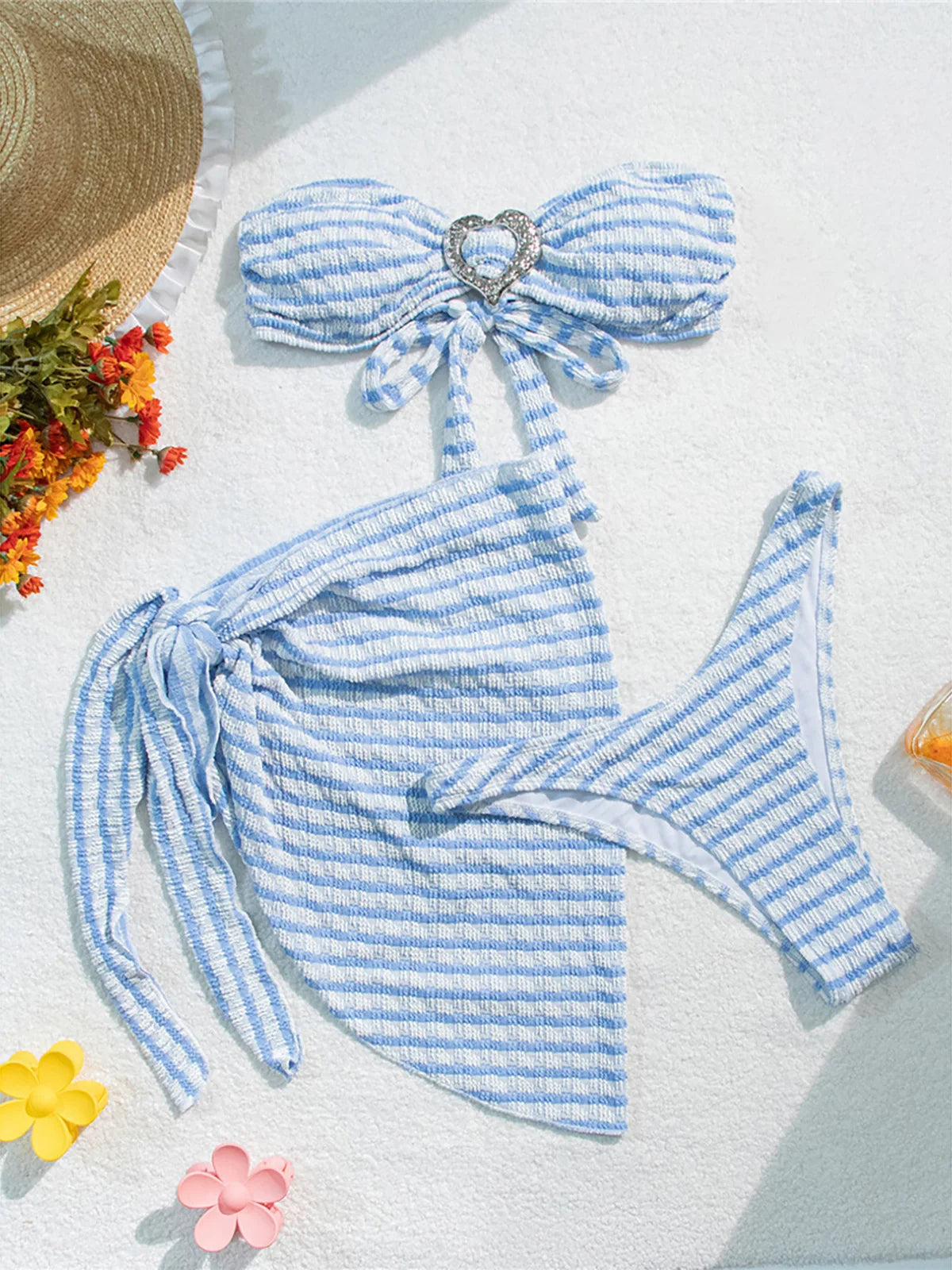Cute and flirty, the Sugar Coast Bikini features pastel tones, soft textures, and a jeweled heart centerpiece. Comes with a matching sarong for a full girly-chic summer vibe.