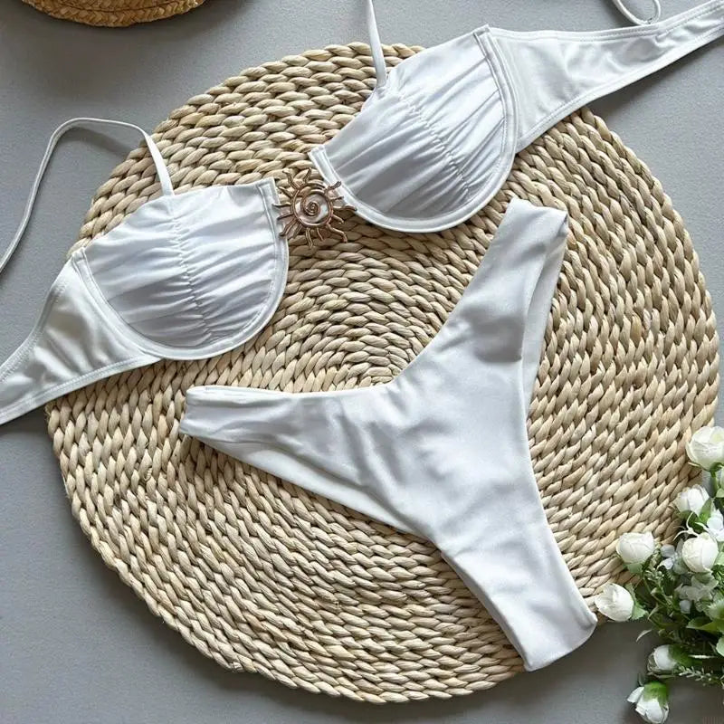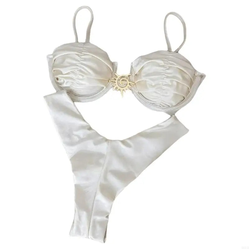 Dare to glow with the Aurea Shine Bikini, a two-piece set designed to enhance your curves with elegance and confidence. Featuring a push-up top that lifts and shapes the bust, and high-cut bottoms for a flattering silhouette, this bikini is perfect for sun-drenched days and unforgettable beachside moments. The soft, shimmery fabric catches the light beautifully, adding a radiant and sophisticated touch to your summer look.