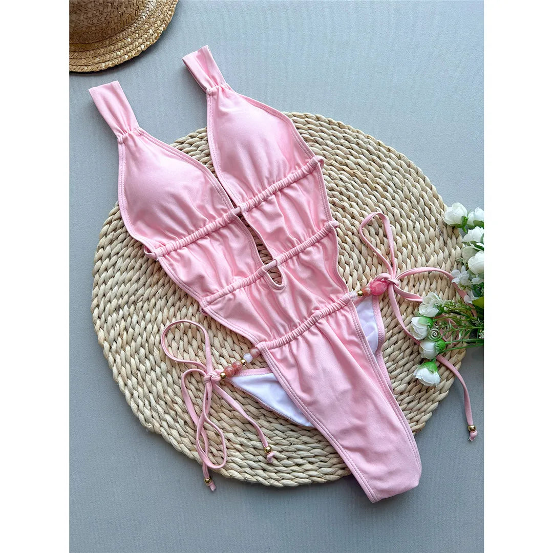 Feminine and effortlessly chic, the Blush Swimsuit brings a romantic twist to bold beachwear. Designed in a soft blush pink tone, this one-piece features ruched detailing and delicate cut-outs that flatter your curves with elegance. The adjustable side ties are adorned with pearl-like beads, adding a playful yet refined touch. Crafted from smooth, stretchy fabric, it's perfect for stylish getaways, poolside lounging, or that sunset swim.