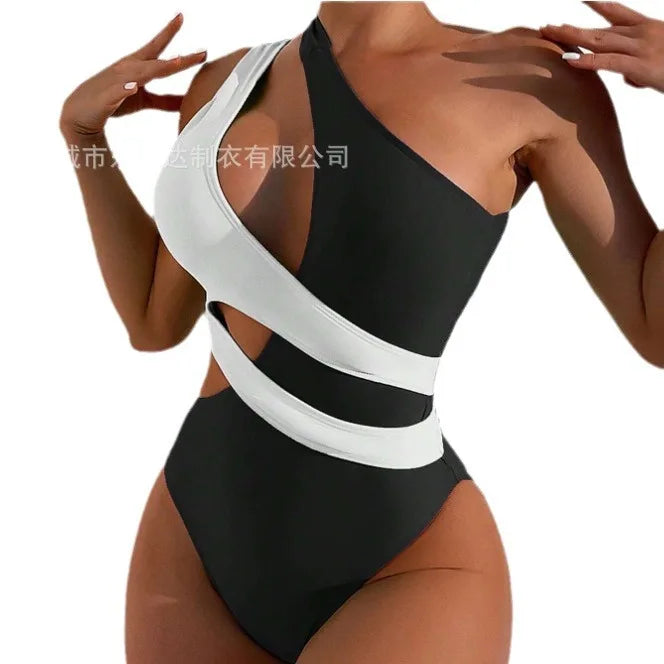 Black and white swimsuit with an asymmetrical design and a single wide strap on one shoulder, offering a modern and sophisticated look. The waist cutouts accentuate the silhouette, adding a bold touch to this elegant and stylish piece.