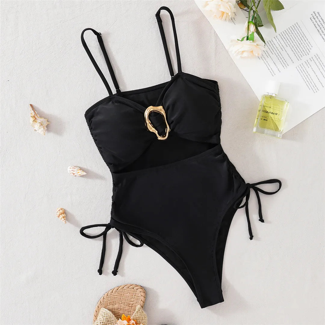 Elegant black swimsuit featuring a gold metal detail at the center, adding a touch of luxury and sophistication. Side ties allow for a customizable fit, enhancing the silhouette with charm and style. Perfect for those who want a bold and modern beach look.