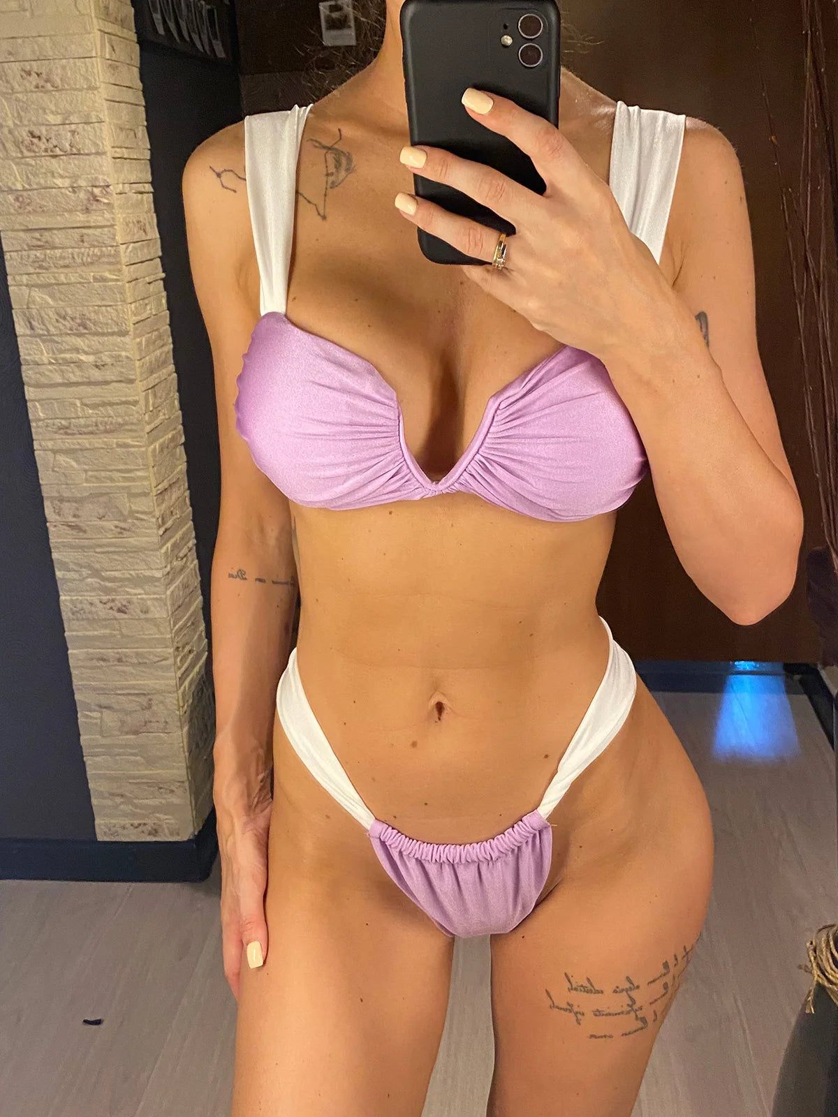 Delicate yet sophisticated, this satin lilac bikini is a true statement of elegance. Featuring thicker white straps for support and style, its V-neckline enhances the neckline with a flattering, feminine touch. The soft sheen of the satin fabric adds a hint of glamour, making it perfect for those who seek lightness with a refined presence. Ideal for sun-drenched days with a graceful glow.
