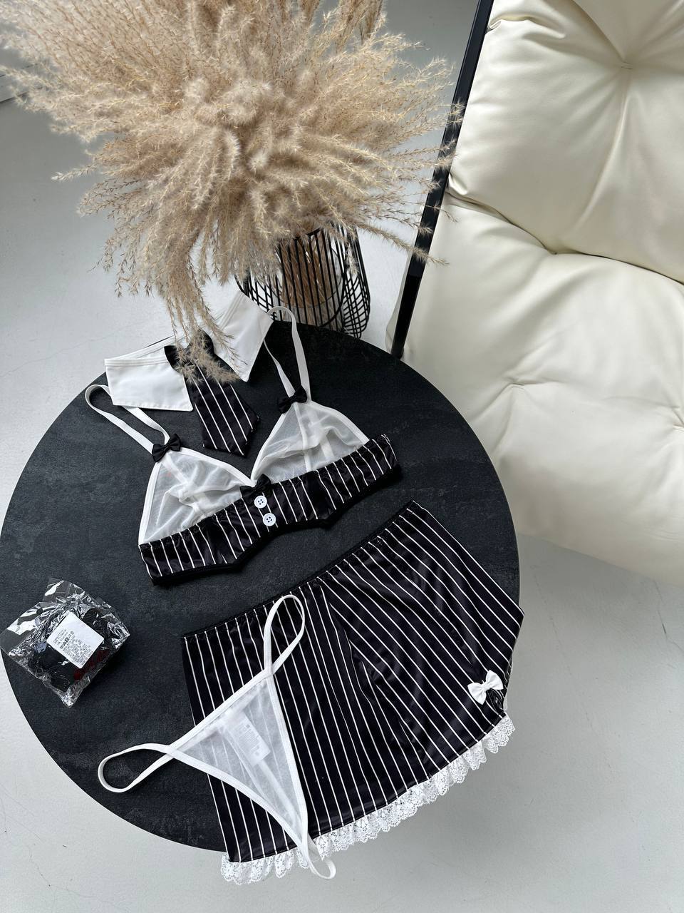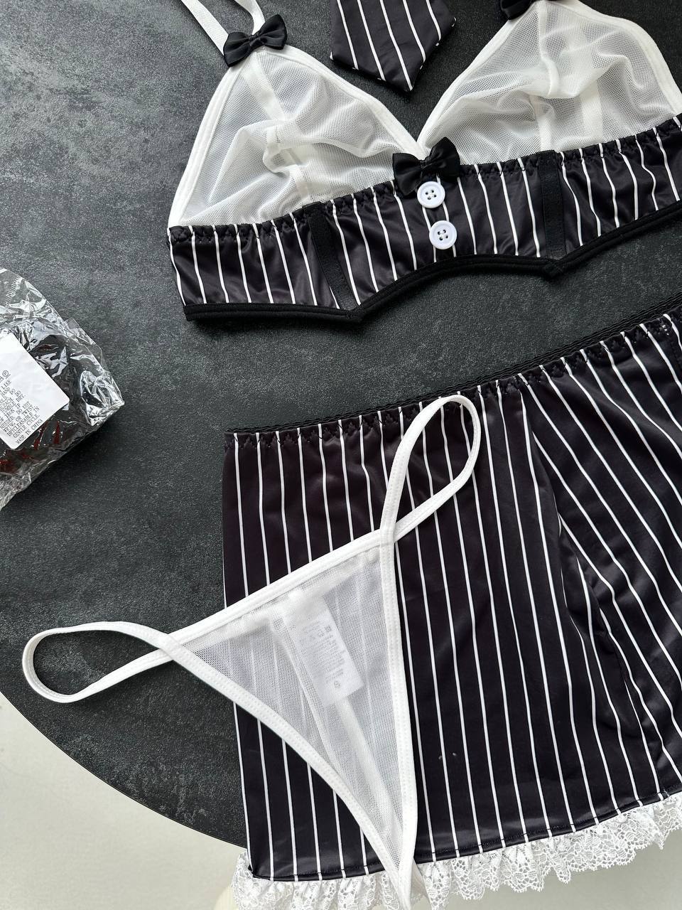 Sada Executive Seduction spája klasickú eleganciu s neodolateľnou zmyselnosťou a vytvára dokonalú fantáziu pre tých, ktorí chcú spojiť silu a pokušenie. Vďaka nadčasovým čiernobielym prúžkom, jemným čipkovaným detailom a elegantným akcentom premieňa táto sada sofistikovanosť na čisté zvádzanie.