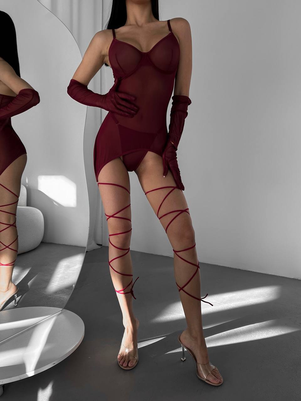 Designen kombinerar mjukhet och visuellt intryck – klänningen formar varsamt dina kurvor medan de långa meshhandskarna ger en oemotståndlig touch av lyx. Benremmarna fulländar looken med en modern och provocerande charm.